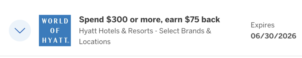 - Earn a one-time $75 statement credit after you use your eligible registered card to spend a minimum of $300 on one or more qualifying room and room rate purchases when you pay for your stay in person at select Hyatt Hotels & Resorts from 3/23/2026 through 6/30/2026. Prepaid reservations are excluded. You must book direct.