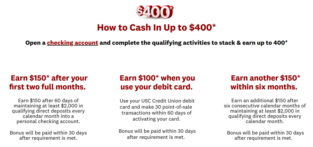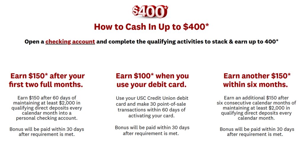 - USC Credit Union is offering a $400 bonus when you open a new checking account and meet the following requirements: