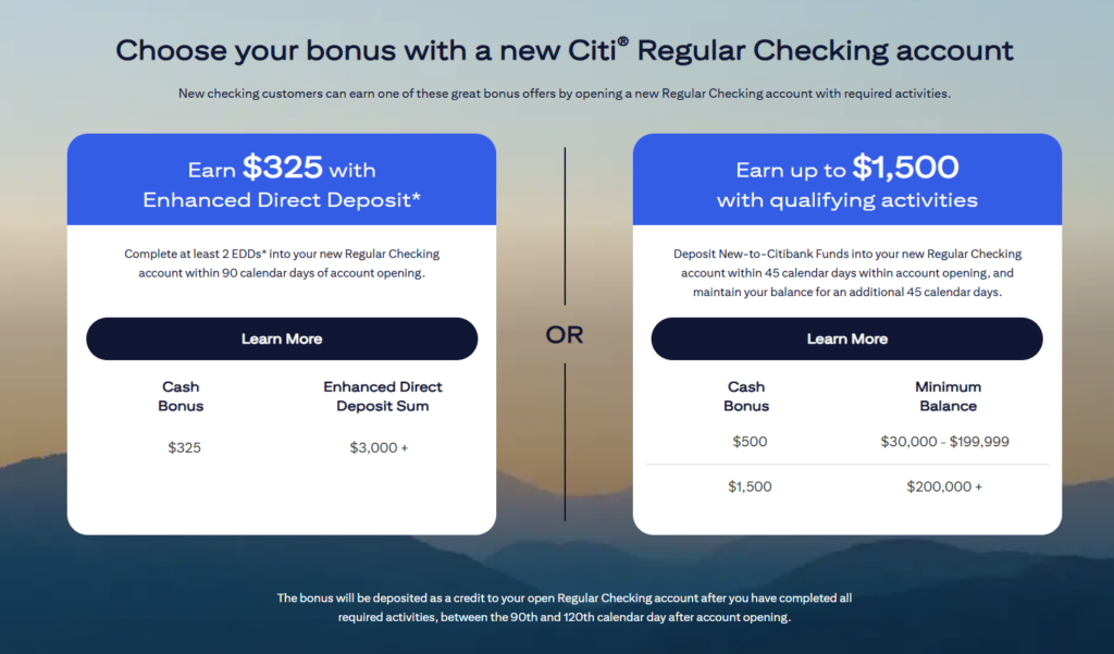 / 425 dollarschecking the bonus- Open a new eligible Citi® Checking account with Enhanced Direct Deposits and enroll in this offer by applying directly from this page.