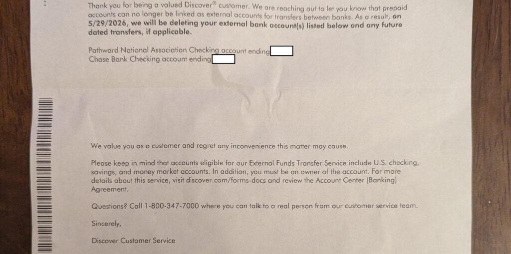 Discover has sent a letter to some account holders informing them that “prepaid bank accounts can no longer be linked as external accounts for transfers between banks. As a result, on 5/29/2026, we will delete your external bank account(s) listed below and any future transfers, if applicable.