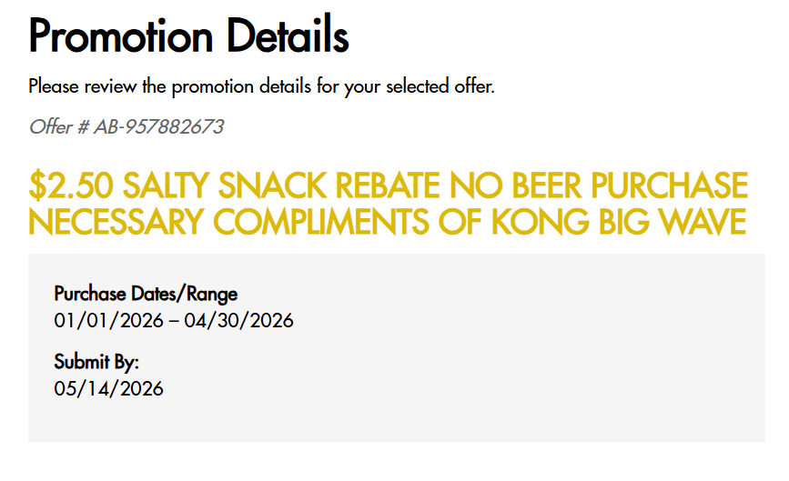 - Kona offers a $2.50 discount when you buy a salty snack for $2.50+. No beer purchase necessary. Limit 2 per address