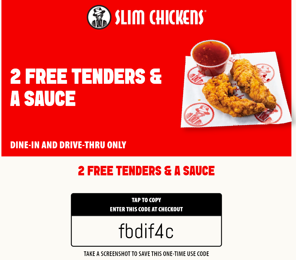 - Slim Chickens offers two free tenders with sauce. Dine in and drive through only, not available at Kiosks. Valid through 4/4 or while supplies last.