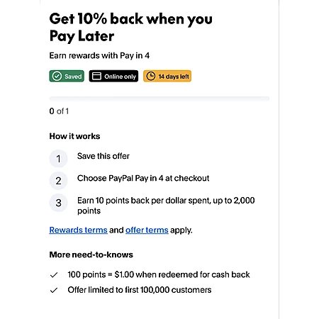 - PayPal offers some account holders 10% cashback when you pay in 4 ($20 cashback limit).